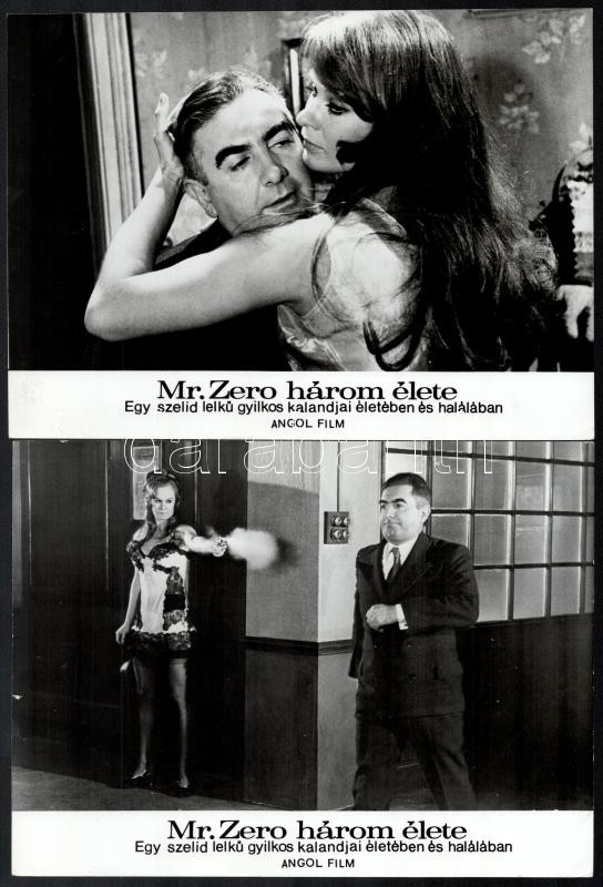cca 1970 ,,Mr. Zero három élete - egy szelíd lelkű gyilkos kalandjai életében és halálában" című angol film jelenetei és szereplői, 17 db vintage produkciós filmfotó, 18x24 cm