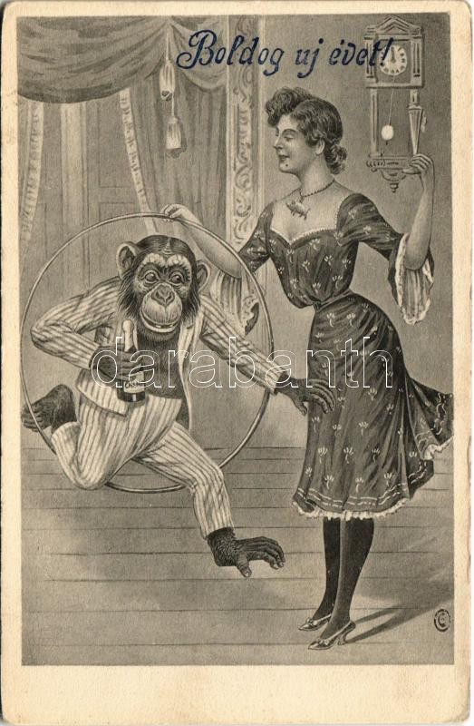 Boldog Újévet! / New Year greeting art postcard with circus chimpanzee... https://www.darabanth.com/hu/416-Gyorsarveres/416.0/Kepeslapok/Cirkusz~2000045/Boldog-Ujevet-New-Year-greeting-art-postcard-with-circus-chimpanzee-EK~II2611953