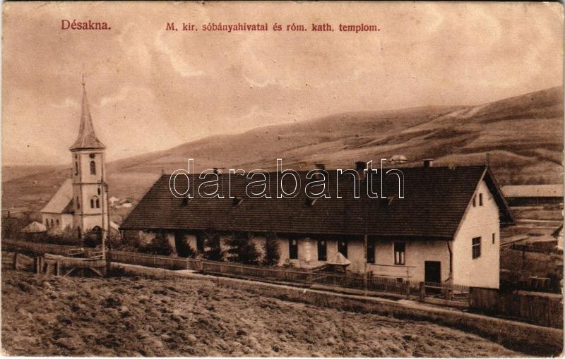 1917 Désakna, Ocna Dejului; M. kir. sóbányahivatal és római katolikus ... https://www.darabanth.com/hu/416-Gyorsarveres/416.0/Kepeslapok/Erdely~2000011/1917-Desakna-Ocna-Dejului-M-kir-sobanyahivatal-es-romai-katolikus-templom-Moskovitz-Vilmos~II2613621