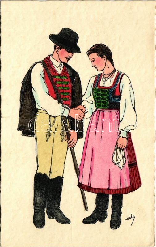 Leírás: Marosszék, Scaunul Muresului; Székely népviselet / Costumi popolari secleri / Transylvanian folklore art postcard s: Haáz (EK)