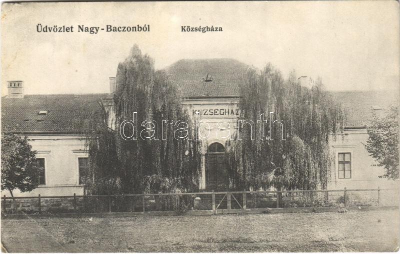 Nagybacon, Nagy-Baczon, Batanii Mari; Községháza / town hall (EB) https://www.darabanth.com/hu/416-Gyorsarveres/416.0/Kepeslapok/Erdely~2000011/Nagybacon-Nagy-Baczon-Batanii-Mari-Kozseghaza-town-hall-EB~II2320629