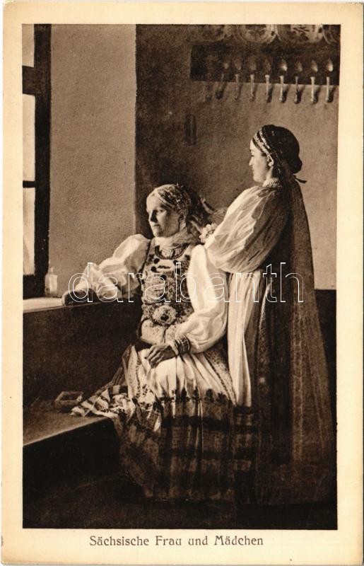 Sächsische Frau und Mädchen / Szász asszony és leány, erdélyi folklór.... https://www.darabanth.com/hu/416-Gyorsarveres/416.0/Kepeslapok/Erdely~2000011/Sachsische-Frau-und-Madchen-Szasz-asszony-es-leany-erdelyi-folklor-Jos-Drotleff-Hermanns~II2615510