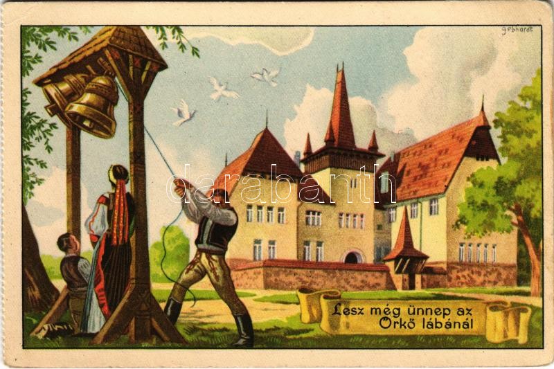 Sepsiszentgyörgy, Sfantu Gheorghe; "Lesz még ünnep az Őrkő lábánál", Székely Nemzeti Múzeum. Kiadja a Székely Egyetemi és Főiskolai Hallgatók Egyesülete / Hungarian irredenta art postcard s: Gebhardt (képeslapfüzetből / from postcard booklet) (EK)
