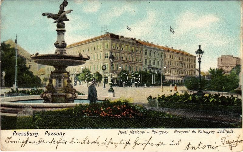 Leírás: 1904 Pozsony, Pressburg, Bratislava; Nemzeti és Palugyay szálloda, szökőkút. Verlag "Bediene dich allein" / hotels, fountain (EK)