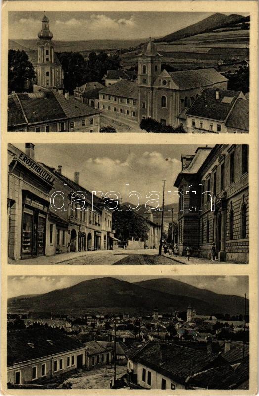 Leírás: Rozsnyó, Roznava; templom, utca, E. Rosenblüth üzlete, látkép / church, street view, shops, general view (EK)