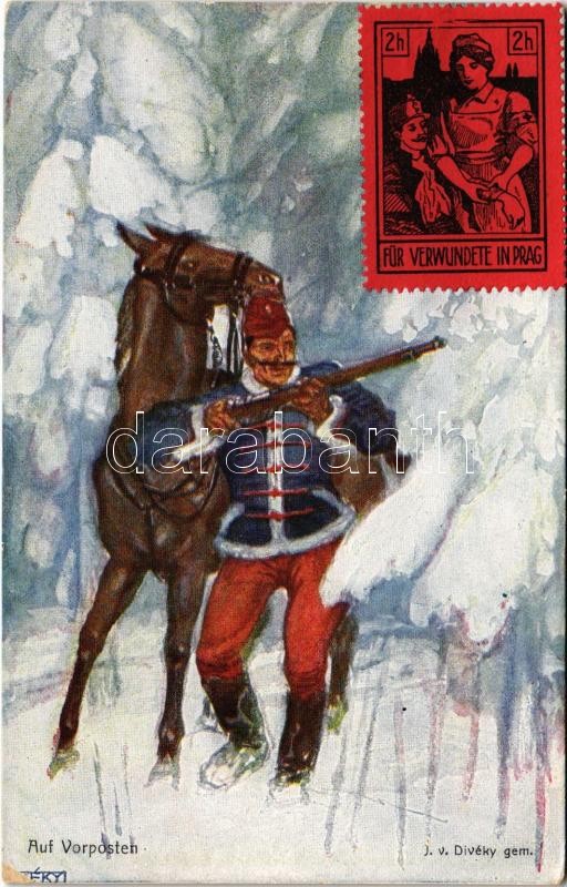 Auf Vorposten. Offizielle Karte für Rotes Kreuz, Kriegsfürsorgeamt, Kriegshilfsbüro Nr. 367. / WWI Austro-Hungarian K.u.K. military art postcard, hussar s: J. v. Divéky (EK)
