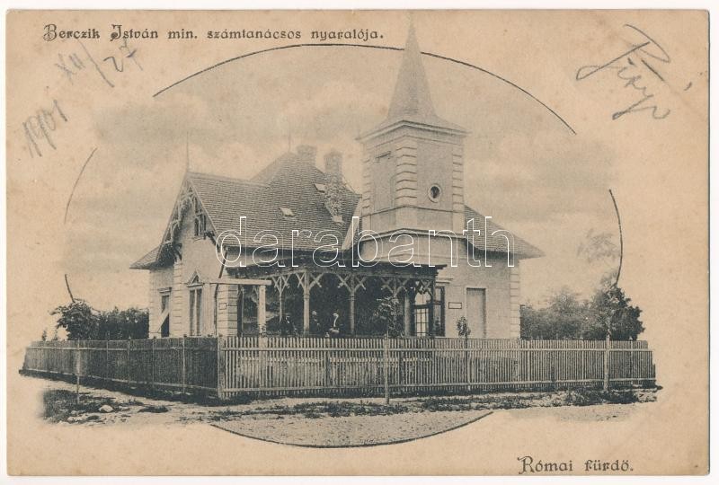 Leírás: 1901 Budapest III. Rómaifürdő, Római fürdő; Berczik István min. számtanácsos nyaralója, villa (EB)