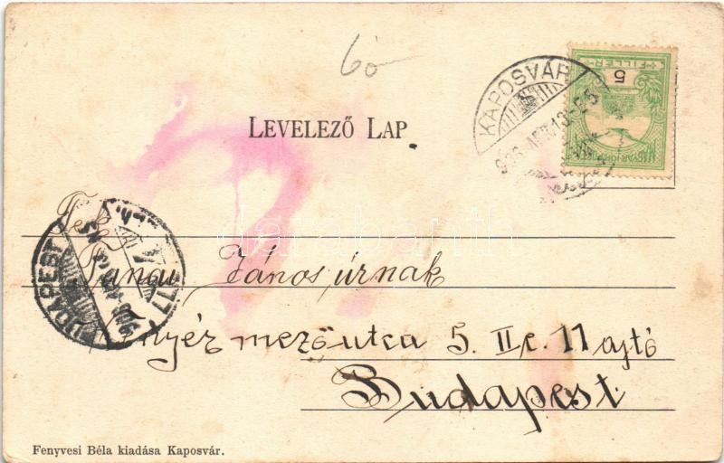 Leírás: 1906 Kaposvár, Fő utca, Müller Pál cipész, Fenyvesi Béla üzlete és saját kiadása (EK)