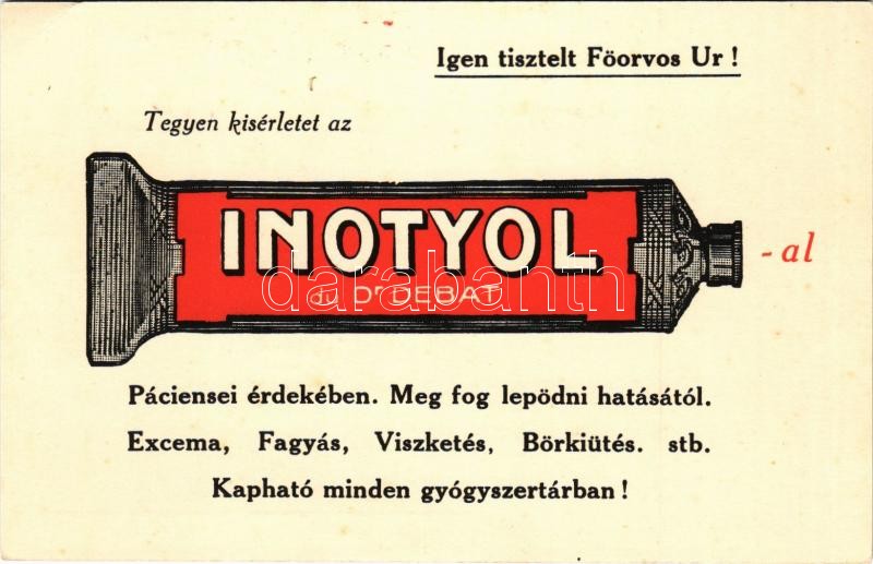 1934 Inotol du Dr. Debat - Tegyen kísérletet a páciensei érdekében. Meg fog lepődni hatásától. Excema, fagyás, viszketés, bőrkiütés stb. Kapható minden gyógyszertárban! Török Labor Gyógyárunagykereskedés és vegyészeti gyár rt. Budapest, Király utca 12.