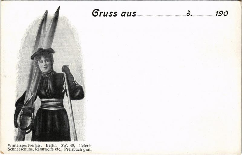 Leírás: Gruss aus... Wintersportverlag, Berlin SW. 46. liefert: Schneeschuhe, Rennwölfe etc. / Winter sport shop advertisement, lady with ski (EK)