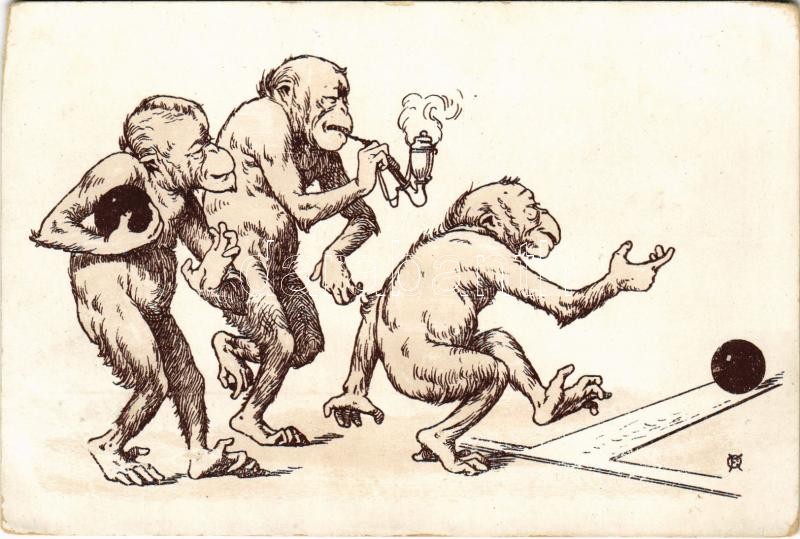 Monkeys bowling and smoking. artist signed (vágott / cut) https://www.darabanth.com/hu/416-Gyorsarveres/416.0/Kepeslapok/Sport~2000072/Monkeys-bowling-and-smoking-artist-signed-vagott-cut~II2615369
