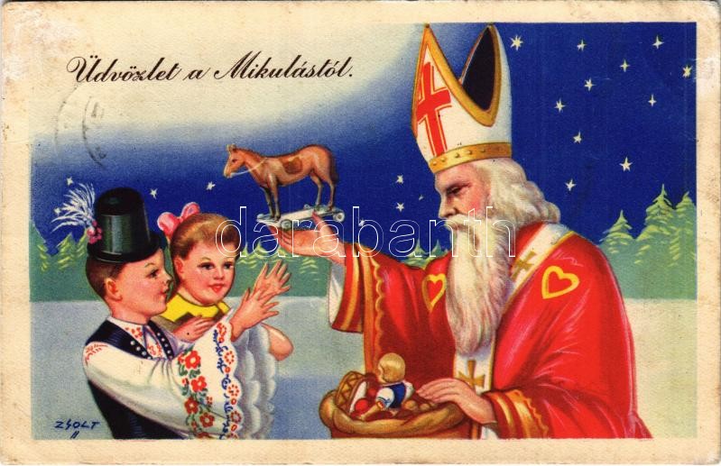 1940 Üdvözlet a Mikulástól / Christmas greeting art postcard with Sain... https://www.darabanth.com/hu/416-Gyorsarveres/416.0/Kepeslapok/Udvozlolapok-Unnepek~2000076/1940-Udvozlet-a-Mikulastol-Christmas-greeting-art-postcard-with-Saint-Nicholas-and-gifts-s-Zs~II2622665