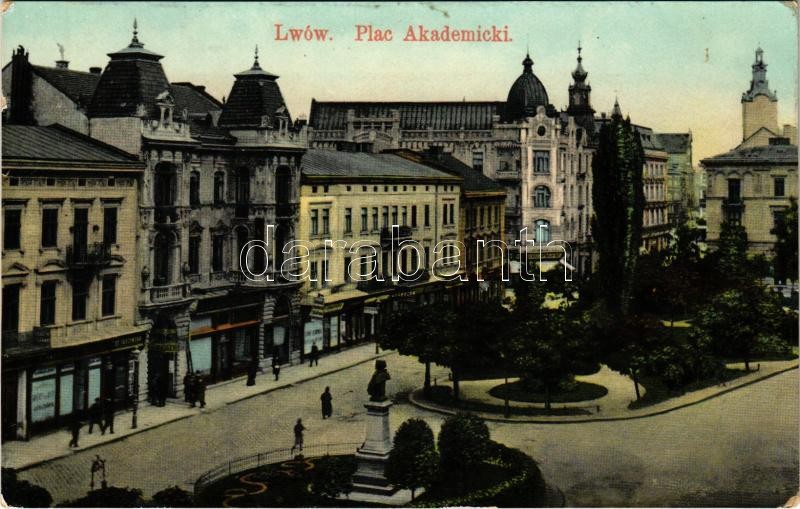 Leírás: 1911 Lviv, Lwów, Lemberg; Plac Akademicki / square, shops (EK)