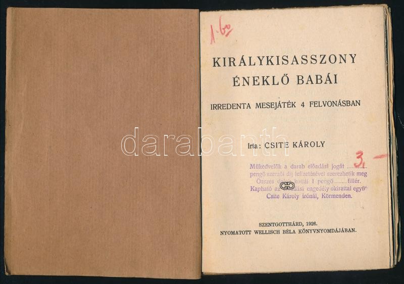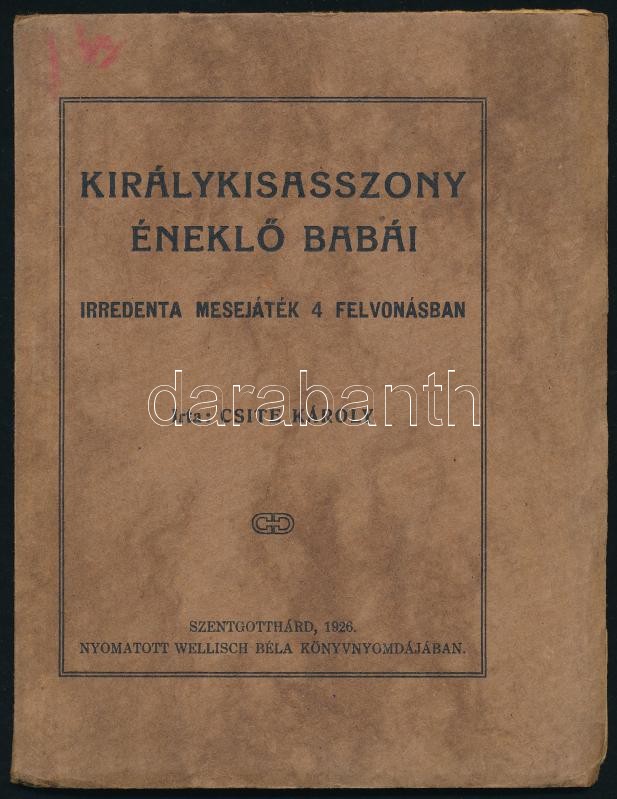 Csite Károly: Királykisasszony éneklő babái. Irredenta mesejáték 4 fel... https://www.darabanth.com/hu/416-Gyorsarveres/416.0/Konyvek/Konyvek-Egyeb-ritkasagok~1000025/Csite-Karoly-Kiralykisasszony-eneklo-babai-Irredenta-mesejatek-4-felvonasban-Szentgottha~II2617663