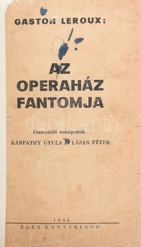 Gaston Leroux: Az operaház fantomja. Bp., 1946. Elek könyvkiadó. Javít... https://www.darabanth.com/hu/416-Gyorsarveres/416.0/Konyvek/Konyvek-Egyeb-ritkasagok~1000025/Gaston-Leroux-Az-operahaz-fantomja-Bp-1946-Elek-konyvkiado-Javitva-modern-vaszonkotesb~II2618925