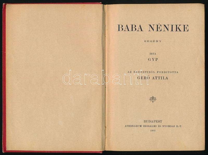 Leírás: Gyp: Baba nénike. Regény. Ford.: Gerő Attila. Bp., 1903., Athenaeum. Kiadói illusztrált, festett egészvászon-kötés, kopott, foltos borítóval.