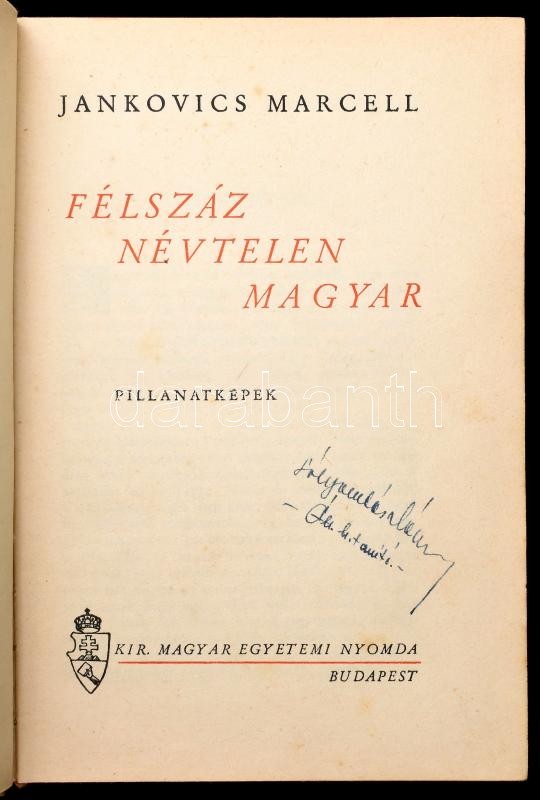 Jankovics Marcell: Félszáz névtelen magyar. Pillanatképek. Bp.,é.n.,Ki... https://www.darabanth.com/hu/416-Gyorsarveres/416.0/Konyvek/Konyvek-Egyeb-ritkasagok~1000025/Jankovics-Marcell-Felszaz-nevtelen-magyar-Pillanatkepek-Bp-en-Kir-M-Egyetmi-Nyomda-Kia~II2621112