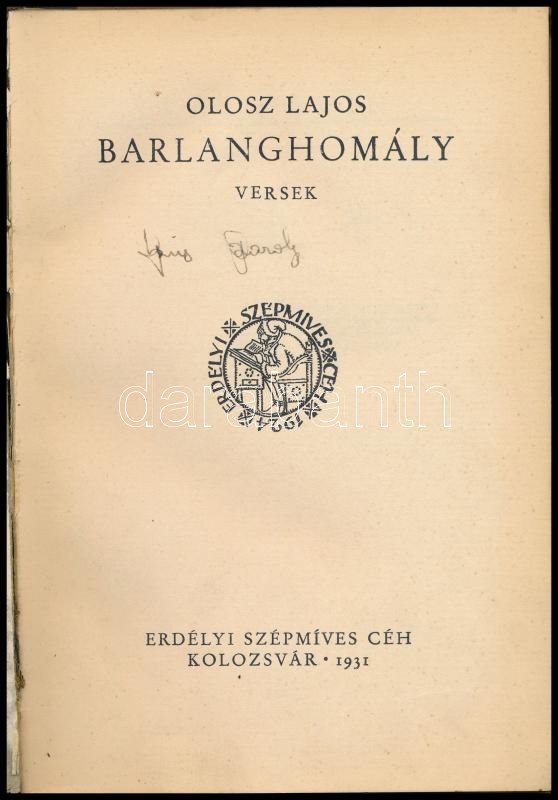 Olosz Lajos: Barlanghomály. Versek. Kolozsvár, 1931., Erdélyi Szépmíve... https://www.darabanth.com/hu/416-Gyorsarveres/416.0/Konyvek/Konyvek-Egyeb-ritkasagok~1000025/Olosz-Lajos-Barlanghomaly-Versek-Kolozsvar-1931-Erdelyi-Szepmives-Ceh-73plus5plusVII-p-Kos-~II2623008
