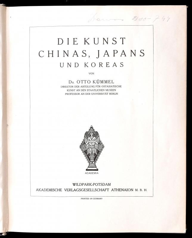 Kümmel, (Otto): Die Kunst Chinas, Japans und Koreas. Handbuch der Kunstwissenschaft. Wildpark-Potsdam, 1929, Akademische Verlagsgesellschaft Athenaion, 2 sztl. lev. + 198 p. + XII t. (színes és fekete-fehér képtáblák). Számos szövegközi és egészoldalas képpel illusztrálva. Német nyelven. Kiadói aranyozott félvászon-kötés, kissé sérült, kopott borítóval és gerinccel, ex libris-szel.