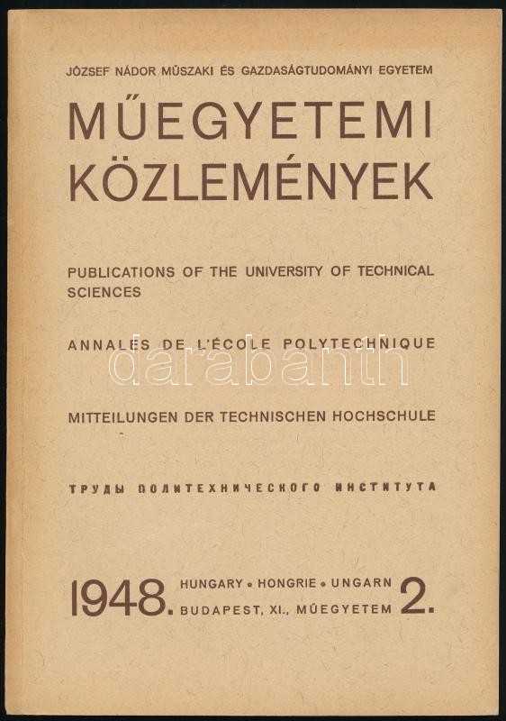 Műegyetemi Közlemények.1948. 2. sz. Szerk.: Dr. Mihailich Győző. Bp., 1948, Mérnöki Továbbképző Intézet (Műegyetemi-ny.), 96 p. Benne többek között Rados Jenő, építész, építészettörténész, ill. Weichinger Károly építész írásaival. Fekete-fehér képekkel, ábrákkal illusztrálva. Angol, német és francia nyelven. Kiadói papírkötés, a hátsó borítón kisebb szakadással.