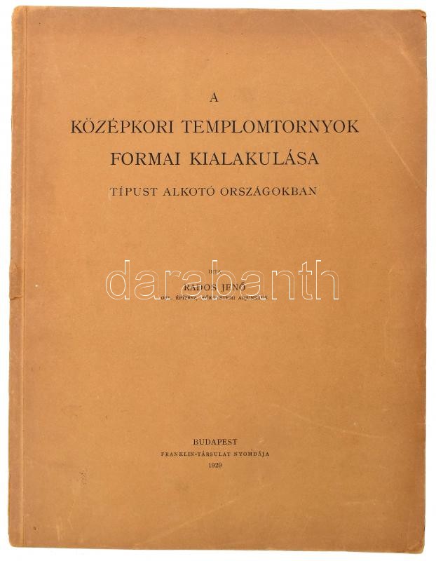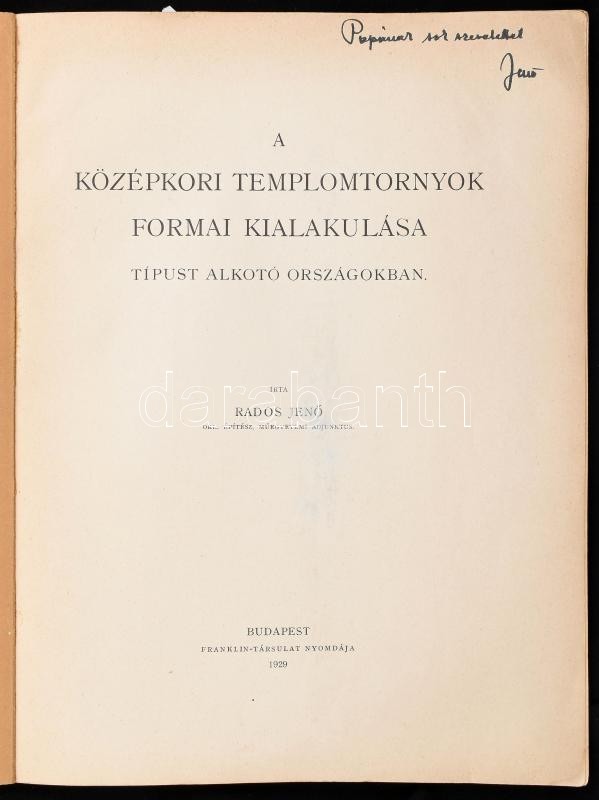 Rados Jenő: A középkori templomtornyok formai kialakulása típust alkotó országokban. Bp., 1929, Franklin-ny., 72 p. Oldalszámozáson belül 17 fekete-fehér ábrákkal illusztrált táblával. Kiadói papírkötés, kissé sérült borítóval, kissé hiányos gerinccel. A szerző által DEDIKÁLT példány.