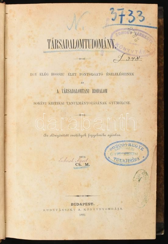 CS. M. (Garamszeghi Lubrich Ágost): Társadalomtudomány. Egy elég hosszú élet fontolgató észleléseinek és a társadalomtani irodalom sokévi kritikai tanulmányozásának gyümölcse. Az előnyösítettosztályok figyelmébe ajánlva. Bp., 1883. Rudnyánszky. 566p. Korabeli félvászon kötésben