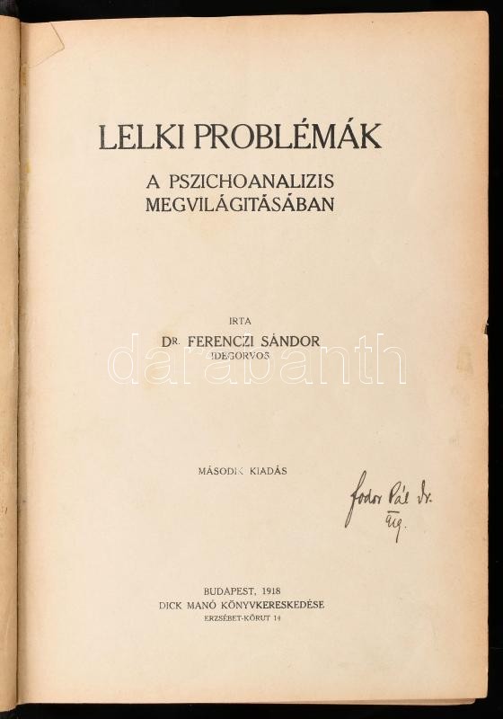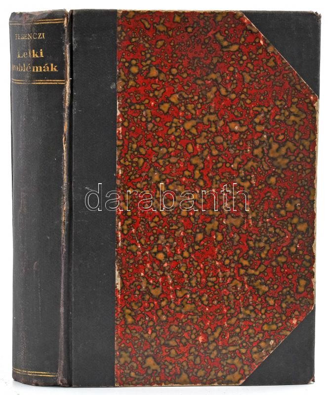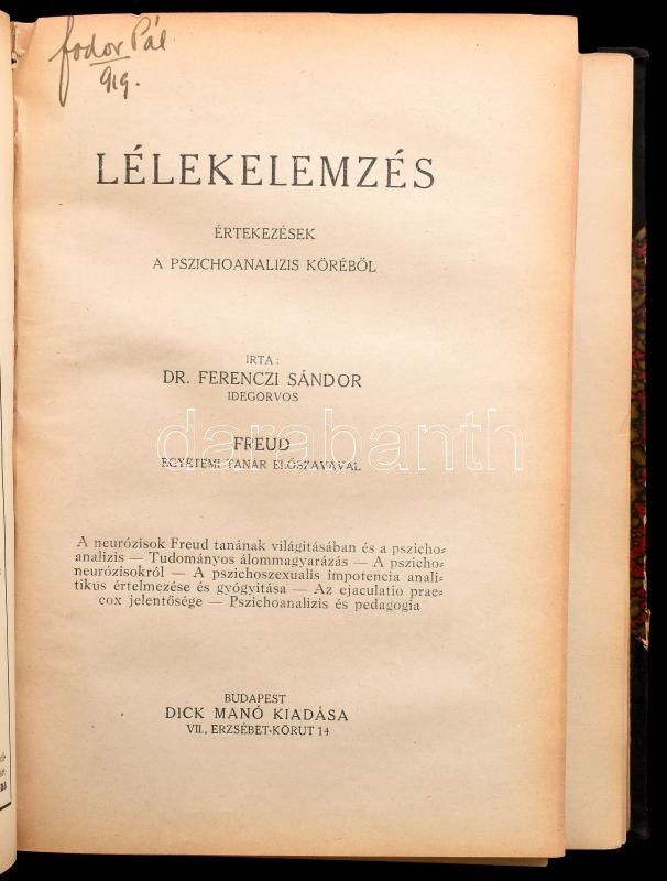 Pszichoanalízissel kapcsolatos kolligátum, benne 5 művel: Ferenczi Sándor: Lelki problémák a pszichoanalízis megvilágításában. Bp., 1918., Dick Manóm,150+2 p. Második kiadás.; Ferenczi Sándor: Lelekelemzés. Értekezések a pszichoanalízis köréből. Freud előszavával. Bp., én., Dick Manó, 93 p.; Prof. Dr. S[iegmund] Freud: Három értekezés a szexualitás elméletről. Fordította és előszóval ellátta: Dr. Ferenczi Sándor. Bp., 1915., Dick Manó, X+2+91+1 p.; Ferenczi, Sándor: Hysterie und Pathoneurosen. Internationale Psychoanalatische Bibliothek Nr. 2. Leipzig-Wien, 1919, Internationaler Psychoanalyitscher Verlag, 78+2 p.; Prof. Dr. S[iegmund] Freud: Über Psychoanalyse. Leipzig-Wien, 1919., Franz Deuticke, 4+62 p. Átkötött félvászon-kötésben, kopott borítóval, sérült, szétvált kötéssel.