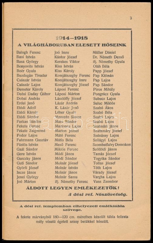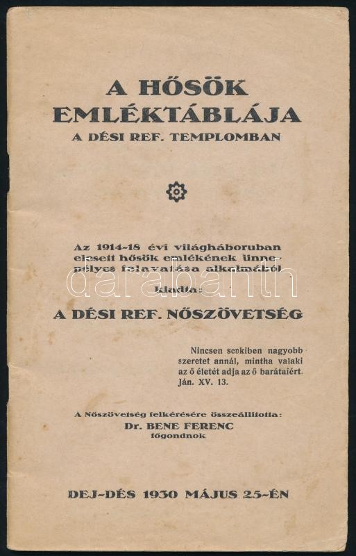 A hősök emléktáblája a dési ref. templomban. Az 1914-1918 évi világháborúban elesett hősök emlékének ünnepélyes felavatása alkalmából. Összeáll.: Dr. Bene Ferenc. Dés, 1930, Dési Ref. Nőszövetség (Medgyesi Lajos-ny.), 29 p. Kiadói tűzött papírkötés, kissé sérült, foltos borítóval.