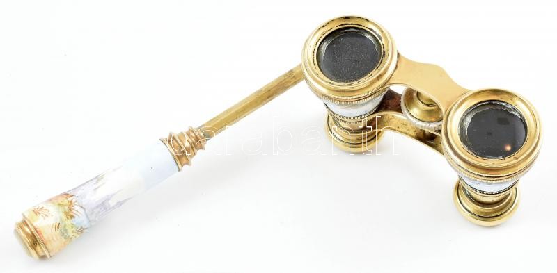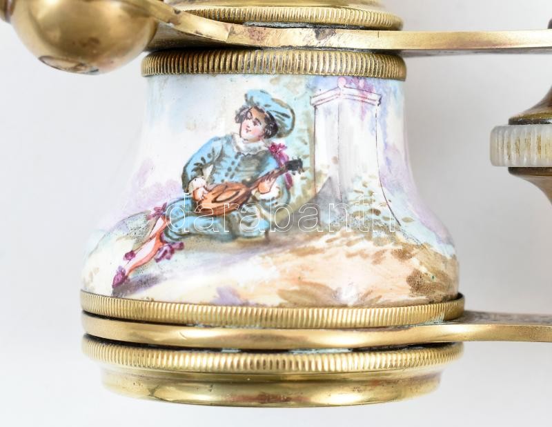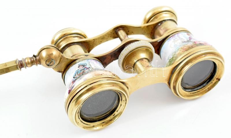 Leírás: Színházi látcső, réz, barokk jelenetes zománc díszítéssel, a lencsék körül gyöngyház berakással. Kisebb kopásnyomokkal, 10x5 cm, nyél h: 16 cm
