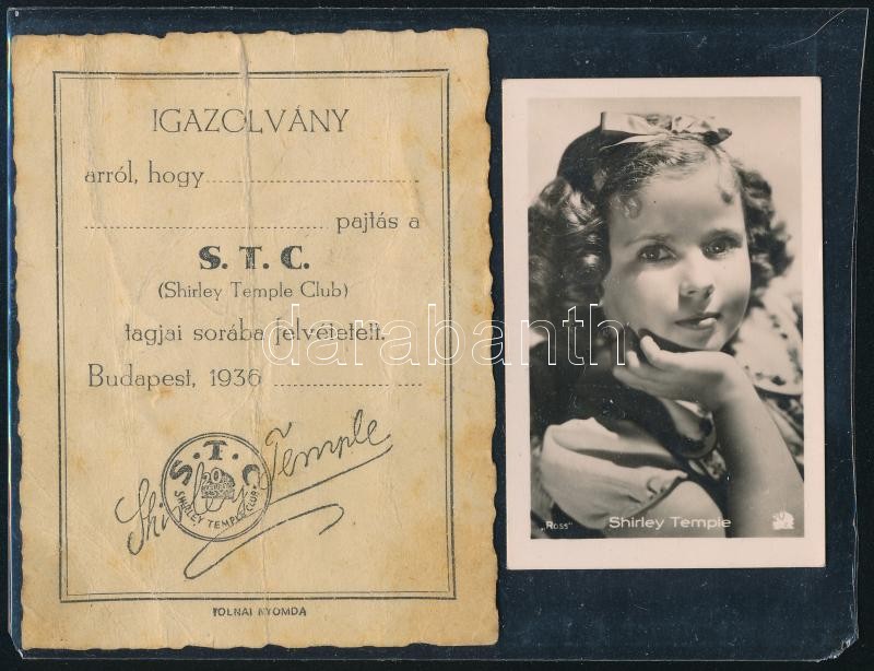 1936 Shirley Temple Club igazolvány és fotó https://www.darabanth.com/hu/416-Gyorsarveres/416.0/Mutargy-papirregiseg-egyeb/Judaika~500025/1936-Shirley-Temple-Club-igazolvany-es-foto~II2611472