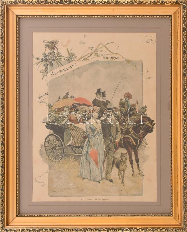 Leírás: Dekoratív üvegezett fakeret, benne E. Jankowski: Auf dem Rennplatz nyomattal, 35x27cm