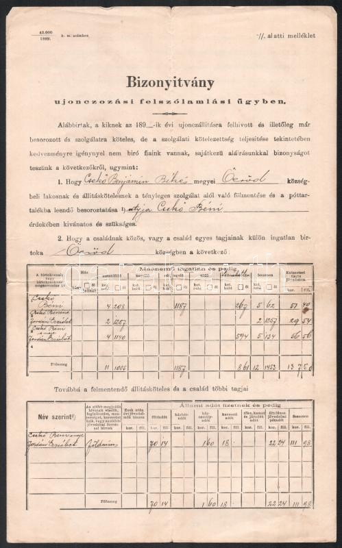 1903-1942 Az öcsödi Csekő család tagjai részére kiállított 4 db katonai igazolvány, dokumentum: bizonyítvány újoncozási felszólamlási ügyben, igazolványi lap, 2 db polgári személyi lap