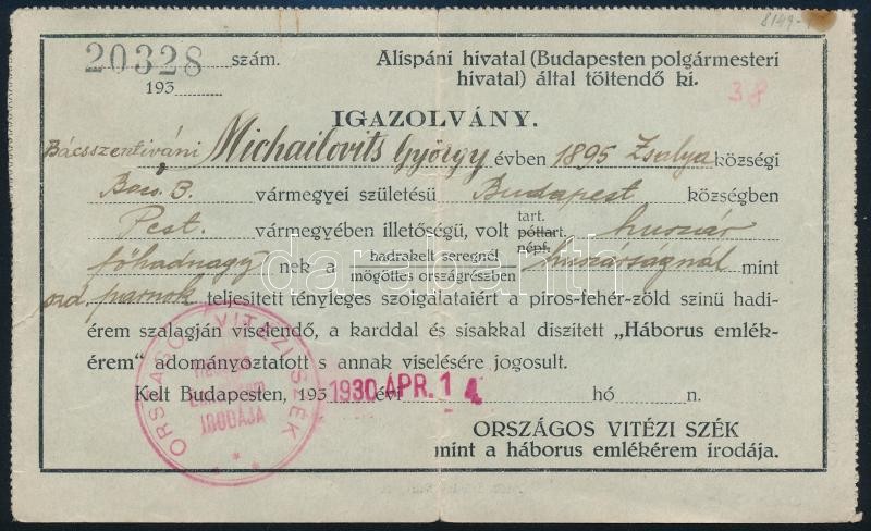 Leírás: 1930 Bp., az Országos Vitézi Szék által kiállított, háborús emlékérem viselésére jogosító igazolvány Michailovits György huszár főhadnagy részére