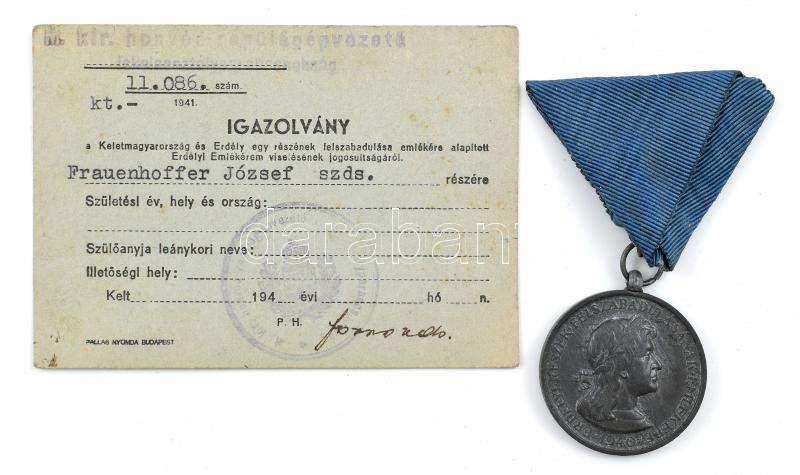 Leírás: 1941 Erdélyi részek felszabadulásának emlékére kiadott emlékérem, Frauenhoffer József repülőszázados részére kiállított igazolvánnyal, jó állapotban