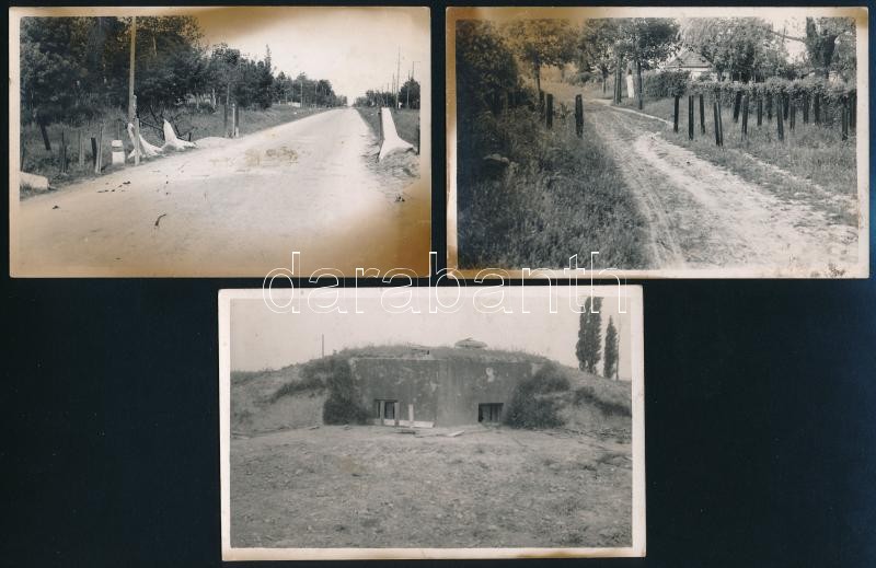 Leírás: 1941.V.27. Jugoszláv bunker, tankcsapdák és akadályok a visszacsatolás utáni Délvidéken, 3 db fotólap, hátoldalukon dátumozva, 14x9 cm