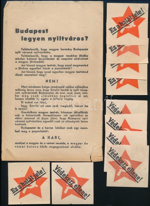 Leírás: 1944 Budapest legyen nyíltváros? Németpárti propaganda szórólap Budapestnek + 10 db szovjetellenes röpcédula