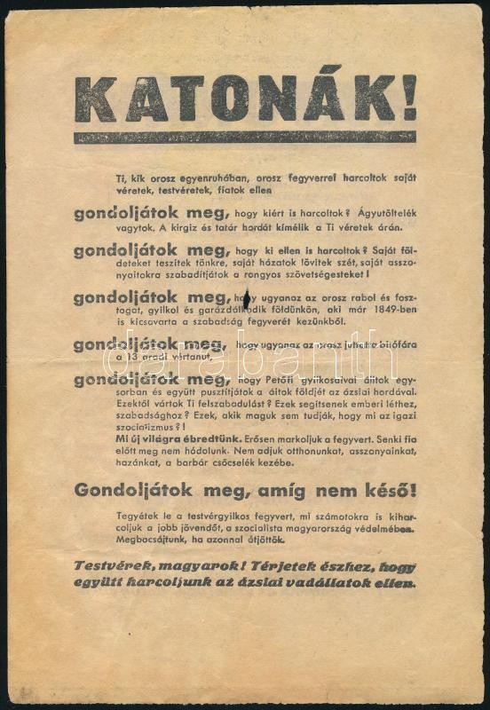 Leírás: 1944 Katonák a Vöröshadseregben harcoló magyarok szovjetellenes nemzetiszocialista röplap