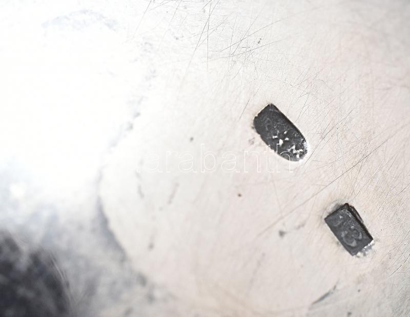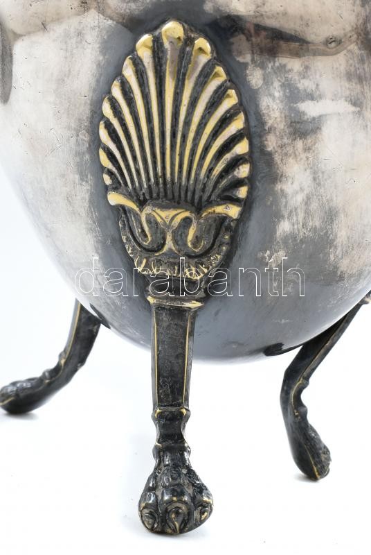 Ezüstözött alpakka teáskanna, figurális madaras kiöntő, fedelén makk motívum fa fogantyúval, egy horpadás az oldalán, jelzett, feloldatlan: R csillag M??. m: 24 cm