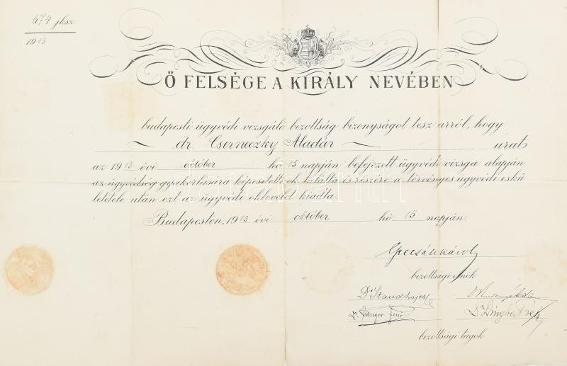 Leírás: 1913 Bp., ügyvédi oklevél, szakadt