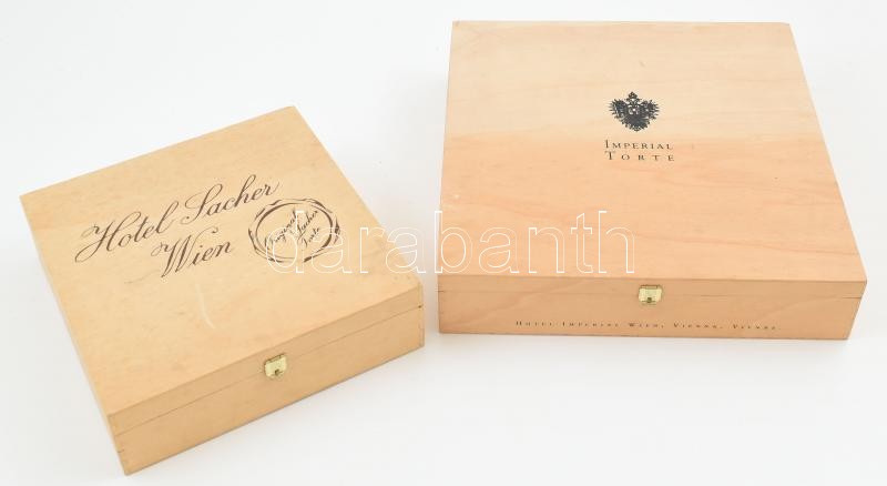 Leírás: Imperial tortadoboz, fa, 29x29x6,2cm + Hotel Sacher Wien tortadoboz, fa 21,7x21,7x 6,4cm