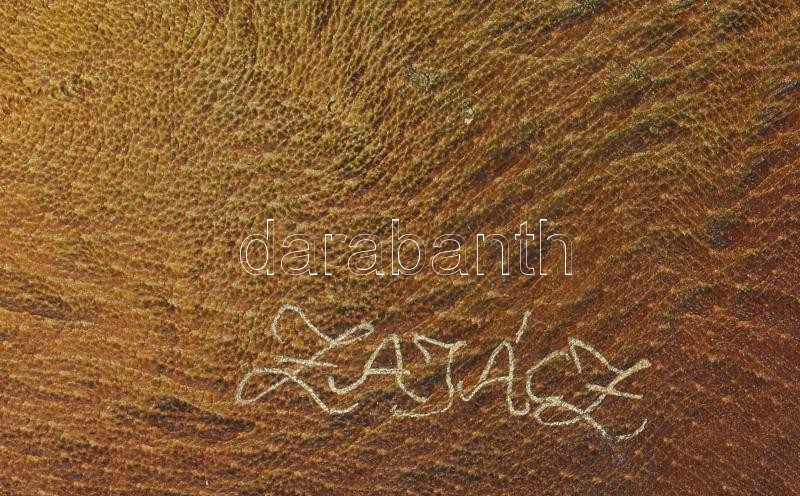 Leírás: Zajácz Tamás (1952-): Ágas-bogas. Bőr falikép, jelzett a hátoldalán, felületi kopásokkal, 90x61 cm