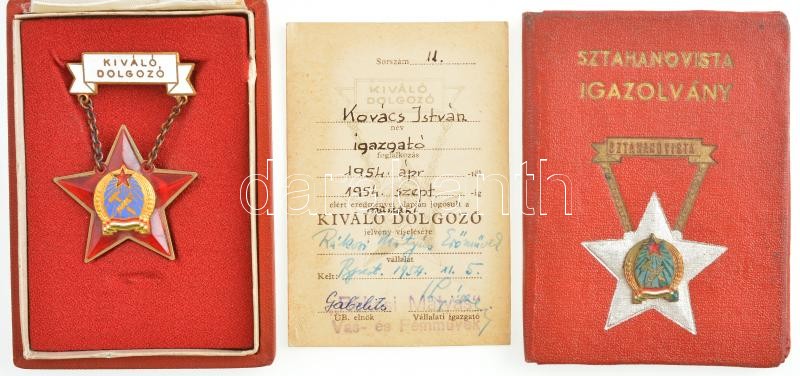 Leírás: 1954. "Kiváló dolgozó" Rákosi-címeres zománcozott fém kitüntetés, viselői igazolvánnyal, dombornyomott Rákosi-címeres tokban + 1954. Sztahanovista igazolvány T:2
