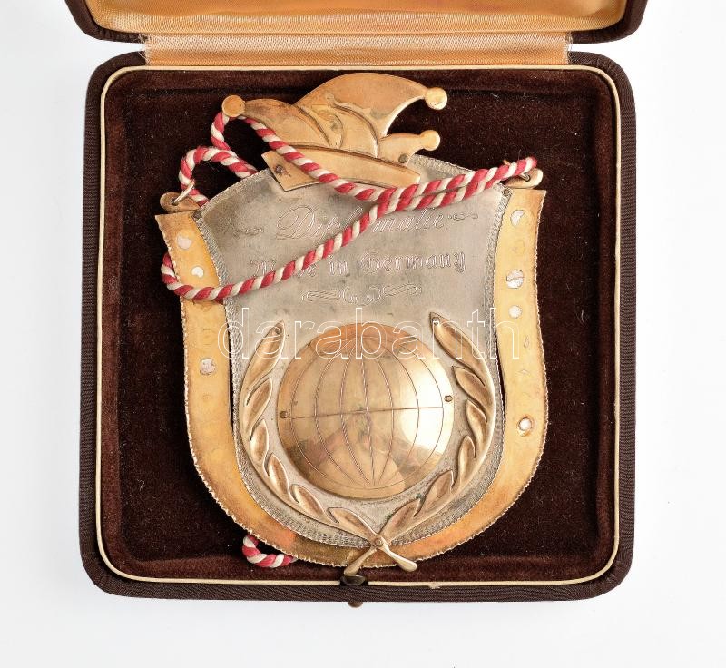 Németország DN "Diplomácia - Németországban készült" részben aranyozott, jelzett Ag, nyakba akasztható emlékérem zsinóron, szélein díszítőkövek ragasztónyomai, "Juvel Wien" dísztokban (131,84g/0.835) T:1- Germany ND "Diplomatie - Made in Germany" partially gilt, hallmarked Ag, hanging commemorative medallion on cord, glue marks on the edges, in "Juvel Wien" case (131,84g/0.835) C:AU