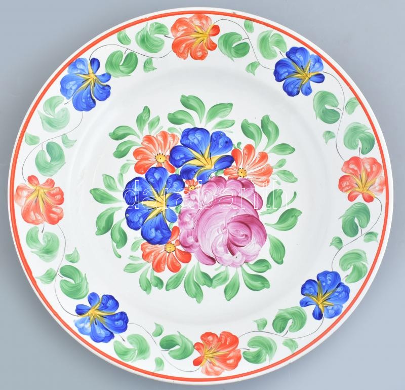 Leírás: Virágmintás fali tányér, kézzel festett, jelzett, kopásnyomokkal, d: 22 cm