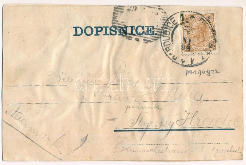 1899 (Vorläufer) Pardubice, Pardubitz; Radnice, Prumyslova skola, Partie od Chrudimky / town hall, school, riverside. Lit. F. Hoblík Art Nouveau, floral, litho (r)