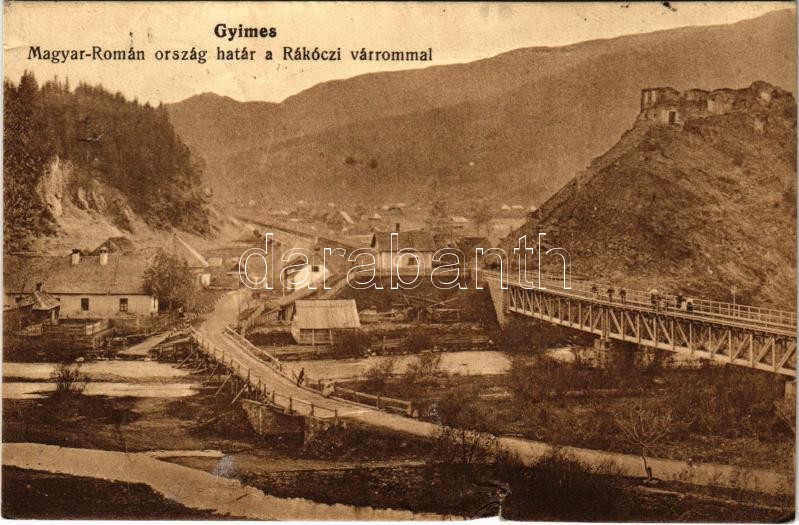 1913 Gyimes, Ghimes; Magyar-román országhatár a Rákóczi várrommal, vas... https://www.darabanth.com/hu/417-Gyorsarveres/417.0/Kepeslapok/Erdely~1500005/1913-Gyimes-Ghimes-Magyar-roman-orszaghatar-a-Rakoczi-varrommal-vasuti-hid-castle-ruins~II2629715