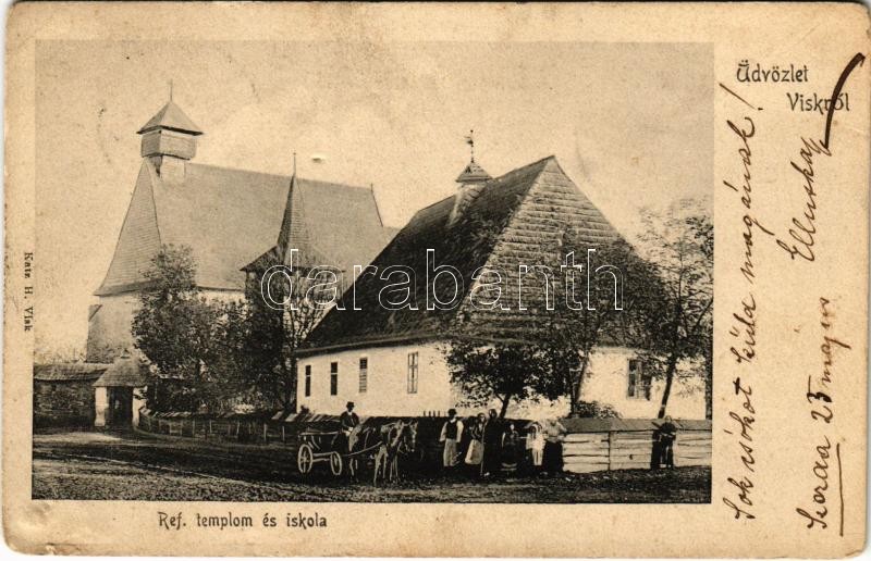 Leírás: 1905 Visk, Vyshkovo (Máramaros); Református templom és iskola. Katz H. kiadása / Calvinist church and school (apró lyuk / tiny hole)