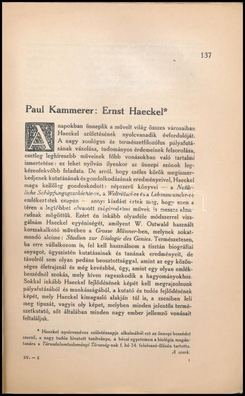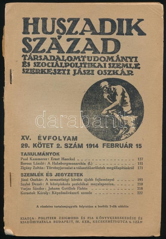 Huszadik század. Társadalomtudományi és szociálpolitikai szemle. Szerk.: Jászi Oszkár. XV. évf., 29. köt., 2. sz. 1914. febr. 15. Bp., 1914, Politzer Zsigmond és Fia, 137-296 p. Sérült kiadói papírkötés, hiányos gerinccel, nagyjából a felénél szétvált.