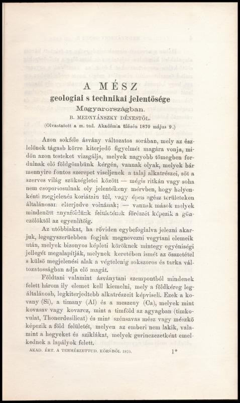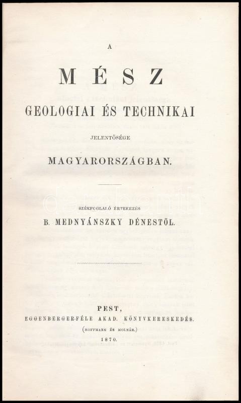 Leírás: Mednyánszky Dénes: A mész geológiai és technikai jelentősége Magyarországban. Pest, 1870. Eggenberger 25 p. Későbbi papírborítóval