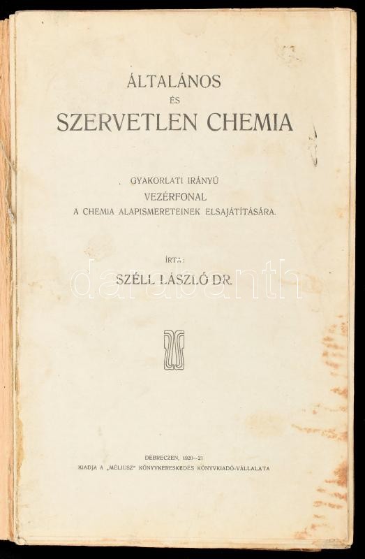 Széll László: Általános és szervetlen chemia. Gyakorlati irányú vezérfonal a chemia alapismereteinek elsajátítására. Debrecen, 1920-1921, Méliusz,X+432 p. Kiadói papírkötés, foltos borítóval, és címlappal, a hátsó borítón gyűrődésnyomokkal, a 33. oldalig a lapok kijárnak. Felvágatlan lapokkal.